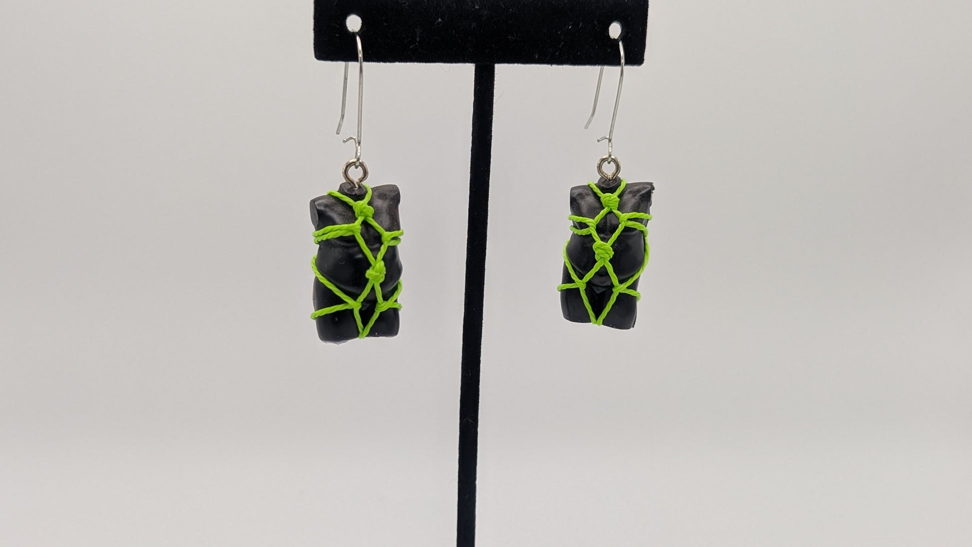 Shibari Earrings, a bold and stylish statement piece that's sure to turn heads! Rope available in every color under the sun, you can opt for the classic black body or get that extra wow factor with glow in the dark! Rope off the perfect look with these intricate earrings!